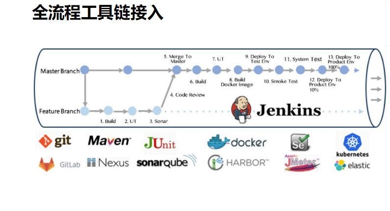 右边可以看到,Jenkins上插接了很多开源的工具,包括商用工具,这些工具提供了我们看到每个环节里的能力。