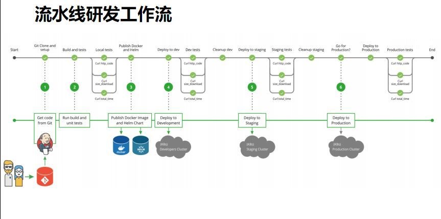 下面这张图更清晰地梳理出研发工作的流程,研发人员下载代码,本地开发测试完成后提交到主线上,触发提交阶段流水线。