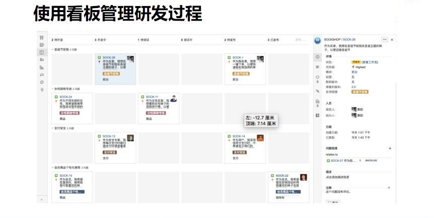基于看板的方式进行开发协同管理。我们可以看到看板里定义了很多阶段,通过看板可以非常清晰地展示出项目的状态,并且把精益思想和配置管理实践整合进来,比如限制在制品数量,明确的规则,需求和代码的集成关联,状态自动流转等,大家可以自己定制。