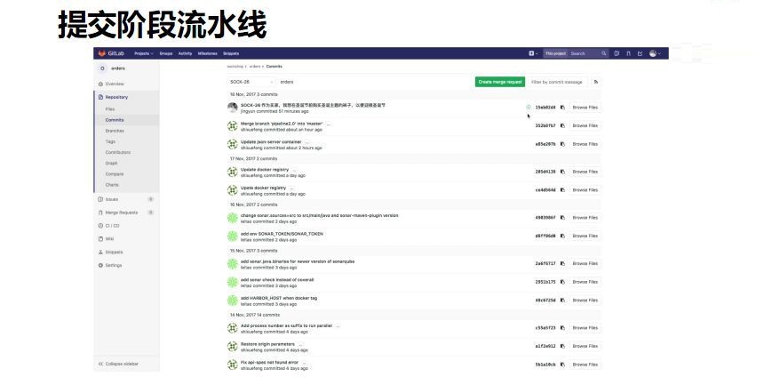 代码提交到特性分支之后,自动会触发提交阶段流水线,主要用于基本的编译和测试,代码规约检查等,给与研发快速反馈,每个环节都可以通过Jenkins的界面获取日志和反馈信息。如果这个环节出现问题会在第一时间反馈出来,帮助研发及时修复,避免代码合入后阻塞主线分支。