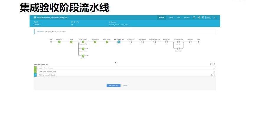 在提交阶段验收完成后,我们会把特性合并到主线分支并触发集成阶段流水线。这个流水线会包含更多的步骤,如等待部署、等待测试的环节。在流水线里存在人工把控的能力,可以完成手工测试和不同环境的部署。