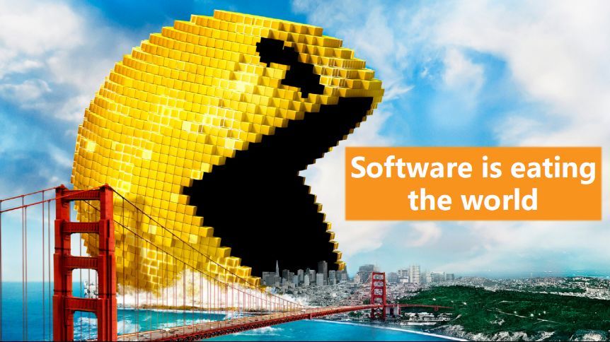 这张图是去年在上海的Jenkins用户大会上,Jenkins的创始人KK在他的主题演讲中分享的,意思是说软件正在吃掉整个世界。