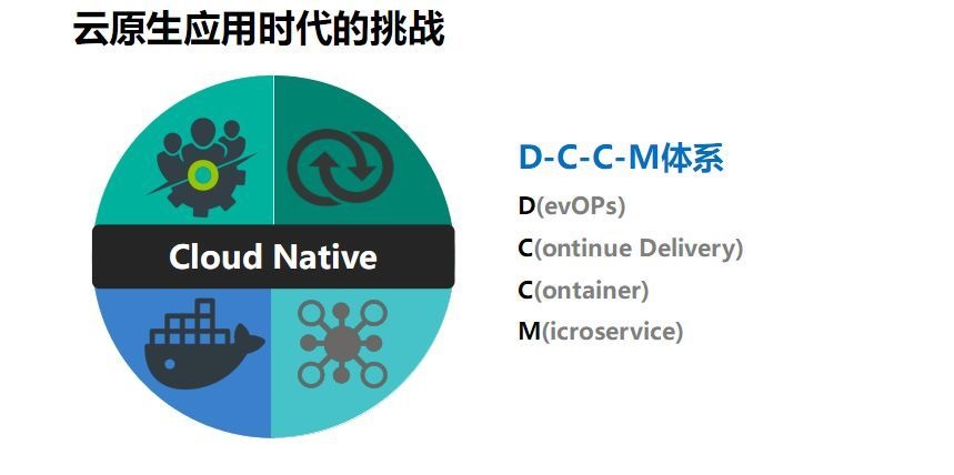 对于云原生应用时代有一个非常复杂的体系,即DCCM体系。D指DevOps,C指持续交付,C指容器,M是微服务。