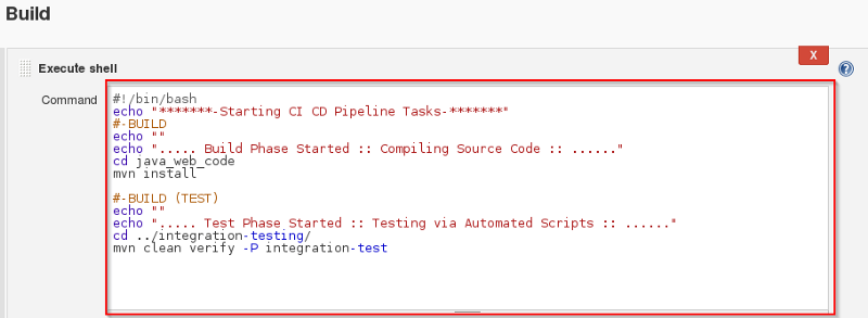 第 11 步:输入 shell 命令。如下示例脚本将会开始代码的集成阶段,并构建出 Docker 容器。