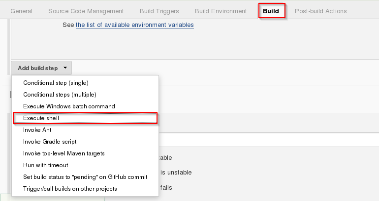 第 10 步:点击 “Build” 选项,并在下面的菜单中选择 “Select Execute Shell”。