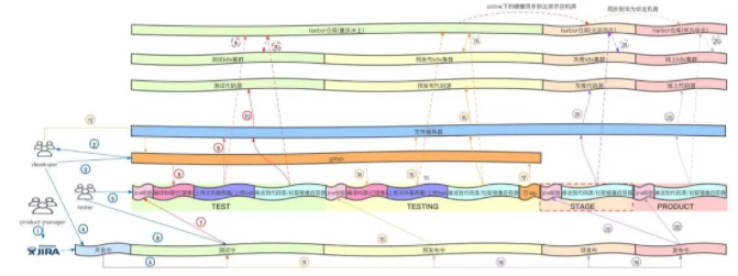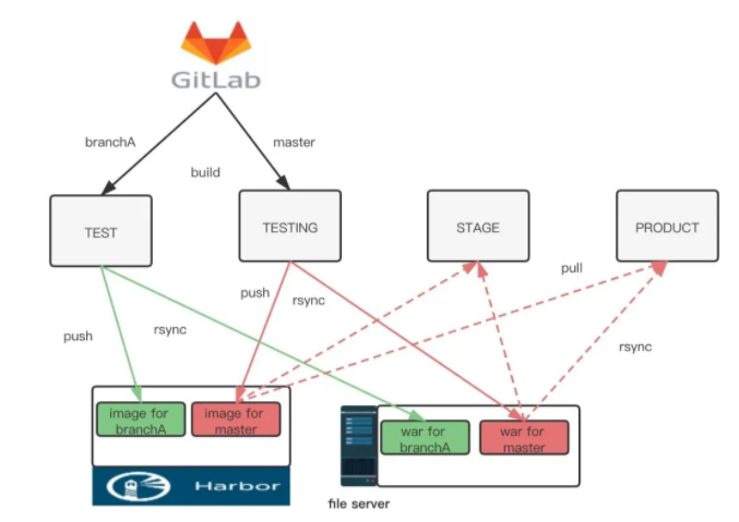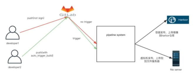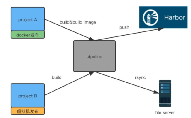 值得注意的是,我们引入了Docker发布,所以我们的流水线是支持容器和虚拟机的混合发布的。虚拟机发布方式的制品是存放在一个叫做文件服务器的地方,容器发布方式的制品是push到Harbor仓库的。
