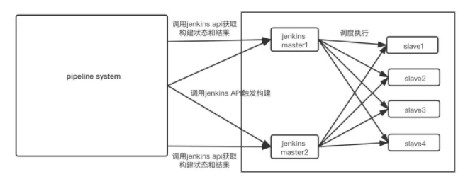 我们将Jenkins作为后台编译服务器,采用的是多master多slave的架构,我们并未直接使用Jenkins的流水线,而是开发了一个叫Pipeline的系统,与Jenkins做对接(此时的对接方式是调用Jenkins的API),由Pipeline系统提供Jenkins作业所需要的全部信息,另外编写了整个过程需要具体执行操作的脚本,通过Jenkins的job配置“Execute