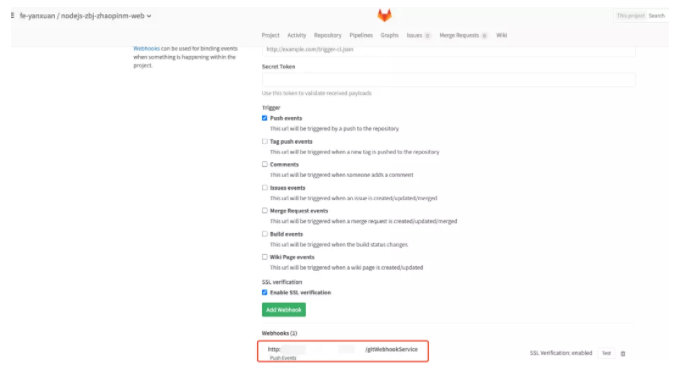 1、为每一个GitLab上的工程添加一个Webhook,每当开发人员向仓库push一次,便会触发Webhook,调用Pipeline系统接口进行一次快速构建。