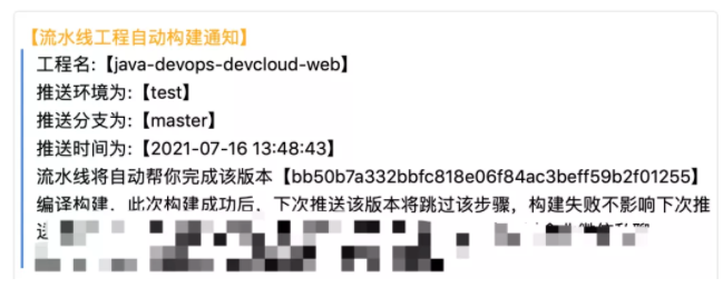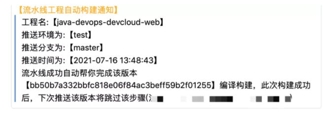3、增加快速构建结果通知,因为整个快速构建过程是后台执行的,所以流水线系统通过企业微信的方式通知到用户本次快速构建的结果。