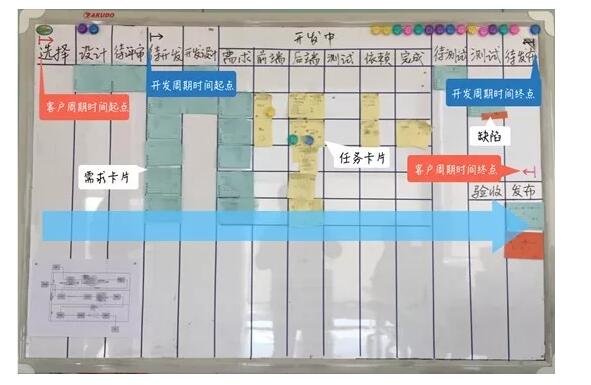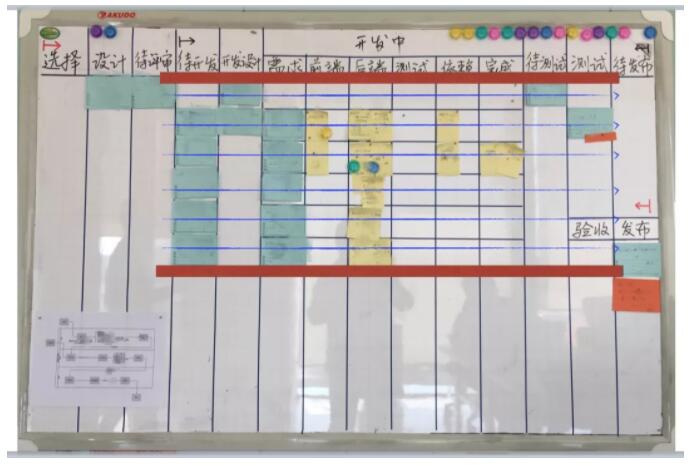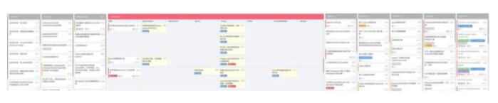 我们单独看“开发中”这个阶段,在这里需求被分解成为任务——图中黄色纸条。任务与其所属于的需求处于同一行中,我们把这样的行成为泳道。泳道的首列(蓝色纸条)是需求,下属任务(黄色卡片)按模块组织在一起,如前端、后端或其他依赖的外部模块,其中任务的最后一列代表完成状态,所有任务完成后,需求进入下一阶段——待测试。