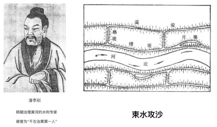 嘉靖到万历年间潘季驯四次临危受命治理黄河,取得前所未有的成效,并总结了切实可行的方略,其中最为重要的思想就是“束水攻沙”。什么是“束水攻沙”呢?潘季驯在治理黄河时既没有蛮力清淤,也不是一味地加高、加宽河堤。他反其道而行,收窄河堤——在大堤(称为遥堤)内再修筑一道更窄的堤(称为缕堤),遥堤用以防溃,缕堤用以束水。河堤收窄了,水流的速度就会加快,将沉积的泥沙带走,这就是所谓"束水攻沙"。