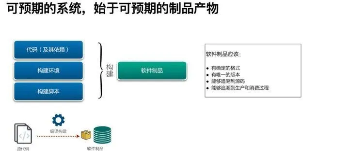 只有在同一份代码(及同一个依赖)、同样构建环境的描述、和同样构建脚本的环境下,所产生的软件制品才是相同的。这里强调的是说所有的东西都要保证一致性,如果说三者是一样的话,那产生出来的制品也是一样的,即使构建时间不同,产出的制品也是相同的。