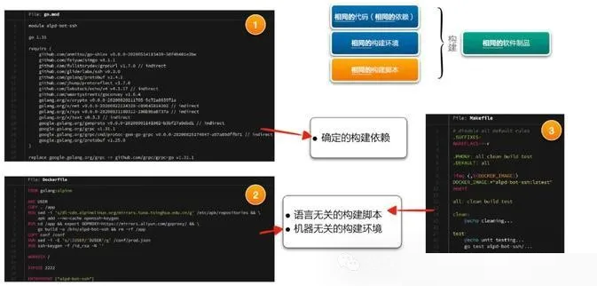 对应的,使用相同的,与代码实现无关的构建脚本也是非常重要的,在Dockerfile的环境中必须指定确定的环境依赖版本。