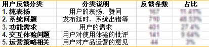 ·时间段——如,改版后一周内、新上线一周后……等。值得注意的是,在产品大事件(如发布、改版)时间段,收集到的问题会较多,用户反馈两极化明显。在系统大事件(down机等)时间段,反馈的问题会较集中,用户反馈多为抱怨。