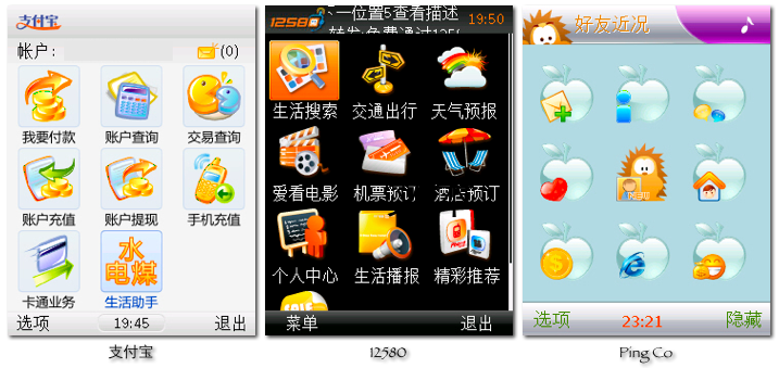 当多个功能之间相对独立,用户根据需求选择其中一个功能时,按钮式布局是一个不错的选择,结构清晰、简单明了。支付宝、12580、PingCo等手机产品的初始界面都采用了典型的按钮式布局方式。
