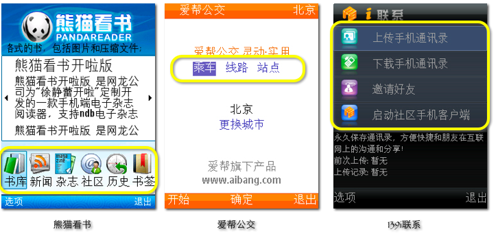 变体。按钮式布局的表现形式多种多样,有很多变体。比如,在熊猫看书中,几个功能按钮排成一行,放在底部,上面是熊猫看书的一些通告;在爱帮公交中,几个链接本质上是就是按钮,可以分别选择乘车、线路或站点查询;在139i联系中,按钮成为长条形,每行一个,排成一列(有些像iphone上的系统控件),每个按钮被激活后,下部都会有对应功能的解释。这些以不同方式展现出来的按钮式布局,或者更加美观,或者更加简洁,把多个功能进行了有效的组织。