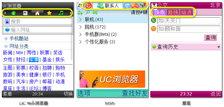标签式布局能够解决按钮式布局中“功能离散”的缺点。当功能之间联系密切,用户需要频繁在各功能之间进行频繁时,标签式布局是另一种设计选择。UCWeb浏览器(以及腾讯QQ浏览器)、手机MSN、爱帮爱逛的公交频道都采用了典型的标签式布局来组织各主要功能。