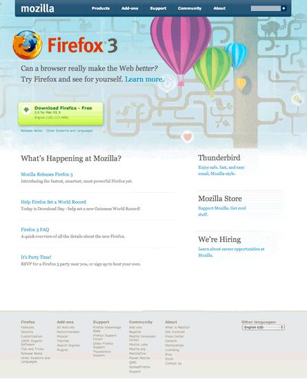 如果你答应每个利益关系人去逐个调整页面的不同细节,你每次的调整都要在用户需求和产品需求之间做抉择,然而,大多数情况下,两种需求是无法同时得到满足。图4和图5是两个不同下载页面的比较。火狐的页面中有一个醒目的下载按钮来触发这个行为。而页面中其他的元素,比如产品特性等就不会那么明显。