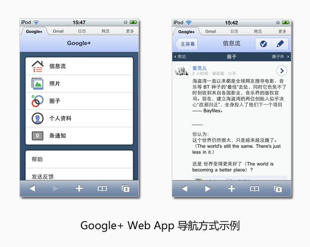首先,分析对比了三款优秀的Web App:Google+、FT Web