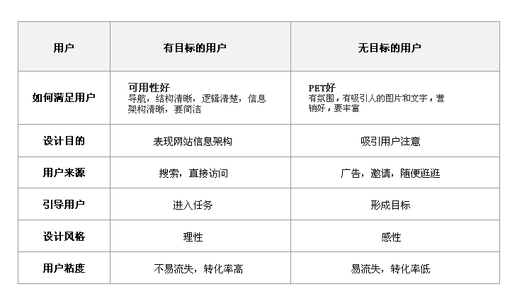 一般网站同时兼顾两种用户。但“可用性“和“PET”这两点,存在天然矛盾,前者要求页面清晰,而从后者的角度来说,清晰意味着死板,后者要求页面丰富,而从前者的角度来说,丰富意味着杂乱。故在设计时要注意权衡。