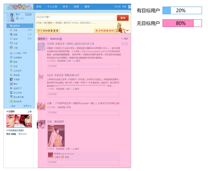 对SNS类网站来说,用户大多数时间是在“随便看看大家都在干什么”,当然也有时,用户来到首页进行发表日志,上传照片等目标明确的操作。