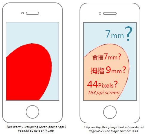 of Thumb 和 The Magic Number is 44(见下图)。即,右利手触屏操作时的热区与死角(如下图),以及触及控件设计的合理尺寸为至少44pix。