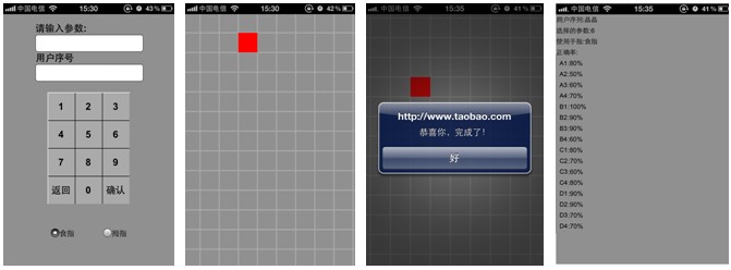 由于本实验为基础研究,因此对于用户的要求不高,不一定非要淘宝用户。面向的对象可以是有潜在触屏手机使用能力的所有正常成年人。右利手为宜。在实验开始前,需对用户的手掌大小等尺寸进行测量,以选择手部尺寸适中的用户。详见国标《中国成年人人体尺寸》GB10000-88中的手部尺寸。采用被试间测试,初步定被试数量为40人左右,要求被试年龄在20岁以上,男女各半。