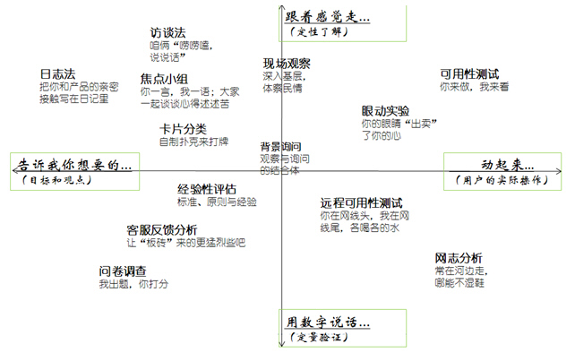 probe)等方法均在人种学研究中有很好的应用;而研究人员最频繁使用的问卷、访谈、焦点小组等方法,都源自于社会学;在自身学科方面,例如任务分析,用例,卡片分类等均会被经常使用。