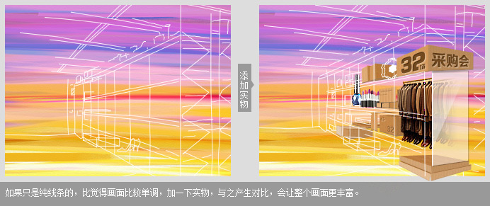 2.画出线描后根据背景色的主色调对线条进行粗细及颜色调整。然后再添加一些实物做一下对比。