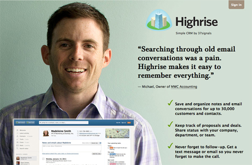 通过这张图片,Highrise向我们展示了一个快乐的人,还有他使用该公司产品的故事。来自实际客户的微笑以及赞许之辞,这是非常正面的、非常容易促使潜在用户认同并期望获取其产品的宣传形式。