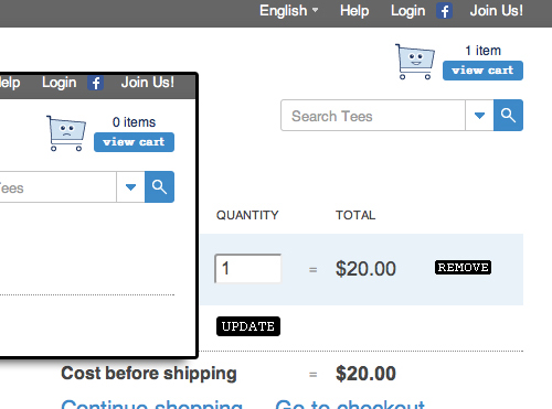 Threadless的购物车在没有商品放入时会呈现出忧伤的表情,反之则会表现的非常开心。这样的小细节会让你觉得平凡而有趣,甚至会不由自主的笑起来。即使用户最终没有产生购物行为,他们也会记住这个可爱的购物车。