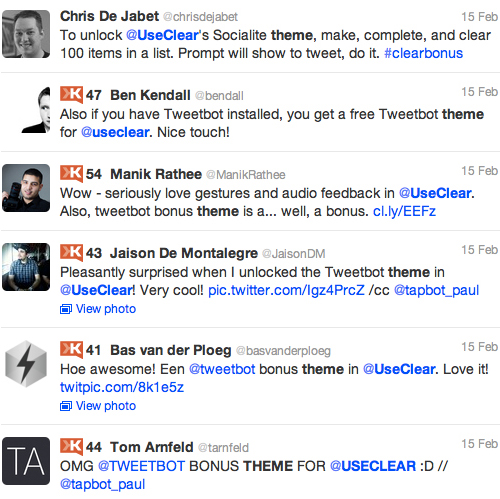 另外,如果你follow了Clear开发者的Twitter帐号,那么还能获取另外一款奖励主题。这个彩蛋的作用依然在于传播。人们会分享他们的热忱,甚至谈论他们获得或是错过了哪些主题。