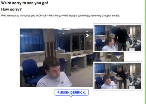 这方面最经典的案例莫过于Groupon的著名段子,"惩罚Derrick"。虽然这个过场发生在用户确认退订之后,但它通过真实的人物以及锋利而又自嘲的幽默,切实拉近了用户与网站之间的距离。在这个多多少少会使退订用户产生内疚的段子之后,Groupon还会再怂恿用户重新进行订阅。虽然你清楚的知道这是他们玩的小伎俩,但在如此具有代入感的段子面前,多数用户会觉得非常有趣,正面情绪和状态完全被调动起来。