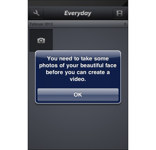 在"Everyday"应用当中,如果你还没有向媒体库中添加照片,那么系统就会非常友好的提示你去给自己“漂亮的脸蛋”拍些照片放到库中——简单的词汇定义了提示信息甚至是产品的基调,换句话说,就是个性。