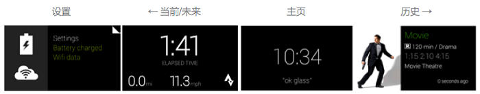 用户通过滚动时间轴切换不同区域显示历史、当前和未来的卡片。新近产生的卡片会在最接近主页卡片的地方出现,而主页卡片是用户唤醒Glass时默认展现的第一界面。