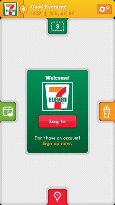 8.传统的导航图标大多会集中在一个区域内,而SevenEleven的APP在此做了很大的突破,将4个部分分别分布在界面的上下左右,简单的界面突然有了运动场的氛围,让APP充满了生命力。
