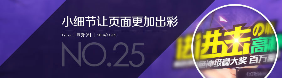 >@畅游VC :我们在平时浏览页面时,经常会为一些优秀作品的细节所惊叹。这些细节之处有的看似非常不起眼,但是设计作品之间的差距有时往往却正是这些不起眼的细节所决定的。什么是细节呢?细节一定是很细微的方面么?其实不然。个人觉得所谓页面的细节之处,并不是页面所必须包含的部分,但是却是拉开页面水平层次的一个重要方面,而且,细节不一定都是很细微的地方,很多大方面的处理也可以体现出细节。这篇文章我们就给大家总结一些在游戏页面的设计中所体现出来的细节之处,大家可以看看这些细节的地方自己在平时的设计过程中有没有注意到。如果有自己没有注意到的地方,那以后可以自己尝试一下,相信会帮助你的页面变的更加出彩!
