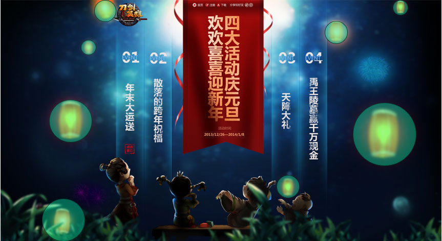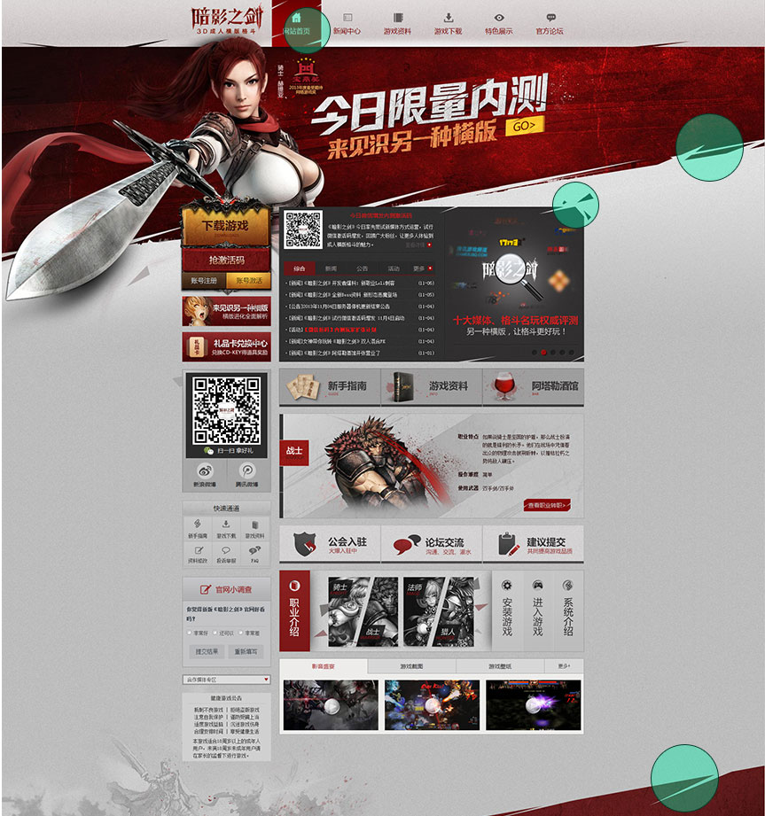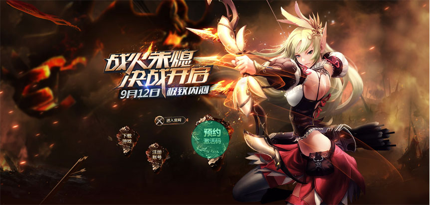 这是一个游戏的官网,受内容的限制,场景的打造上不像普通专题那么灵活。这里的背景打造用了并不复杂的手法,但是为了呼应游戏激烈热血打斗的风格,设计师在处理的时候给导航的hover效果、banner的边缘处及内容区的部分边缘都做了切割碎片的效果,而且banner的背景也不是通常的矩形,而是下面斜切了一部分,使整体画面动感十足。