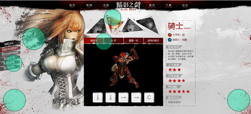 相信大家从圈圈的标识应该也能看出来了,喷溅(血迹)效果几乎被应用到了上图的所有元素中,背景的血滴、人物边缘的处理形式、导航条以及切换标签几乎无一例外。