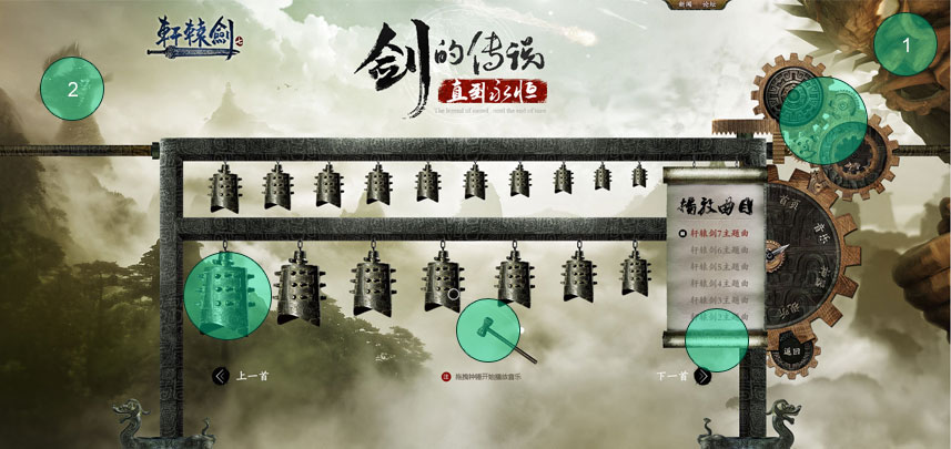 上图是一个非常棒的引导案例,设计师在处理的时候通过素材的拼凑叠加,做出右侧齿轮机关的导航形式;在交互上通过浏览者操控锤子去敲击磬(Qing),增加了页面的趣味性;而且在场景的打造上,圈1中的近景与圈2所处的远景拉开层次,近大远小,近清晰远模糊,画面的纵深感比较强。我们再看一下下面这个例子,看看它的引导是怎么做的。