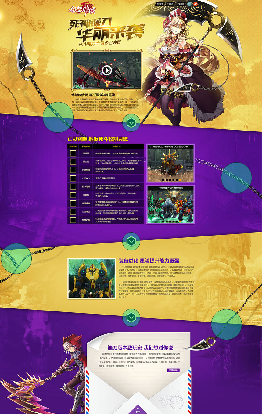这是一个内容比较多的页面,这里设计师把每个大部分的内容用色块进行区分。倘若只是单纯的用色块来分割每一块的内容,那分割处会显得比较生硬,而且容易给人造成内容脱离的感觉,不具有整体性。这里设计师巧妙地运用铁链+镰刀的尖头构成一件武器,从而将页面的各个版块贯穿起来,这里链条不仅起到引导作用,而且还能拉开页面的层次,这是个非常棒的处理。