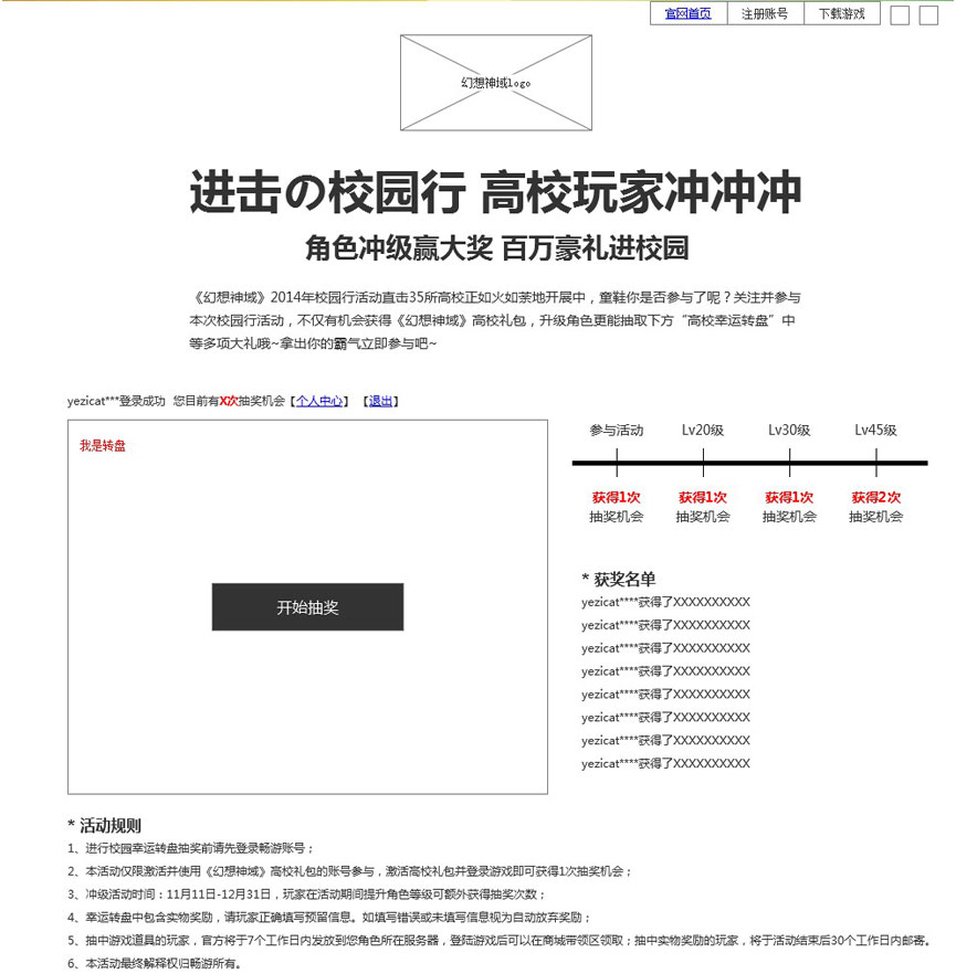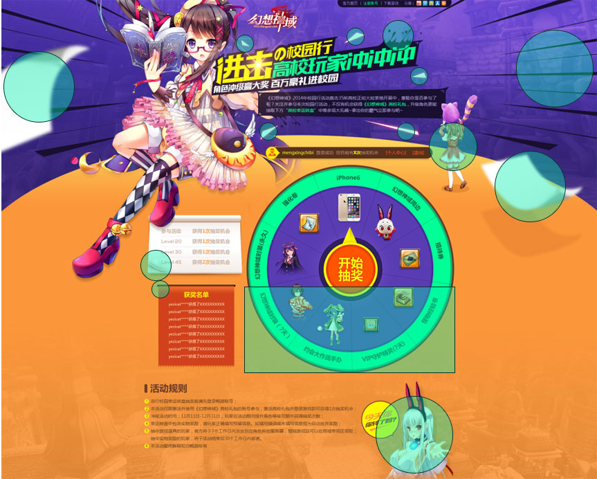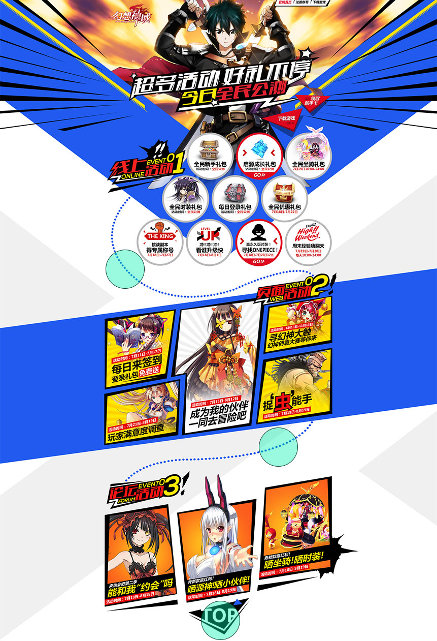 这是一个很劲爆的校园活动UE,结合《幻想神域》二次元动漫的游戏风格以及活动主题“走进校园玩家冲”的概念,我们在页面的设计过程中尽量把页面的氛围做的活泼欢快一些,另外结合校园的主题我们联想一些与之相关的事物例如书本纸张等。那结合这些考虑的因素,于是乎出来的以下的作品,大家来一起找找页面中我提到的那些细节吧。