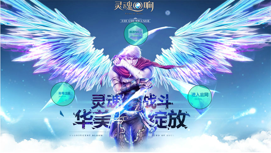这个例子与上一个比较类似,这里选取类似于翅膀质感的水晶来作为按钮。与人物一前一后,拉开了空间,而且风格上也是与页面非常搭配,点击欲较强。