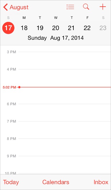 类似的过渡动画出现在用户选择一个日期时:月份视图从所选位置分开,将当前的周日期推向屏幕顶端并翻转出以小时为单位的当天时间视图。这些动画加强了日历上年月日之间的关系的感知度。