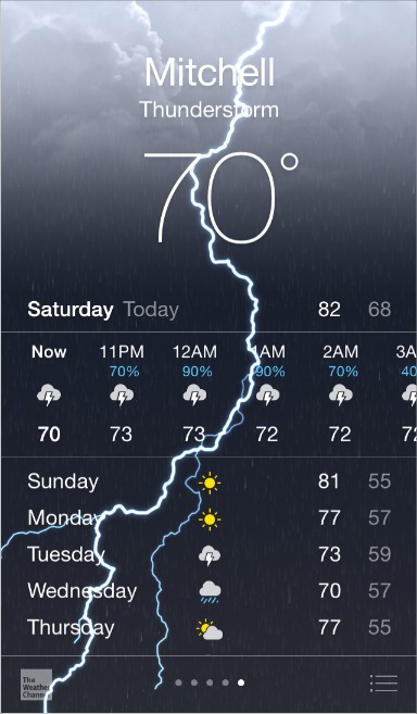 充分利用整个屏幕。天气应用是最好的例子:漂亮的天气图片充满全屏,呈现用户所在地当前天气情况这最重要的信息,同时也留出空间呈现了每个时段的气温数据。