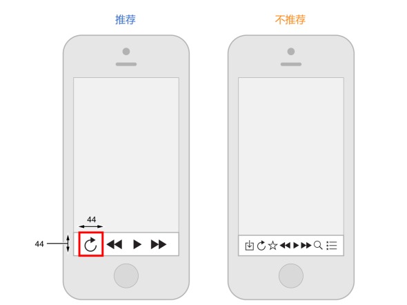 给每个互动的元素充足的空间,从而让用户容易操作这些内容和控件。常用的点按类控件的大小是44 x 44点(points)。