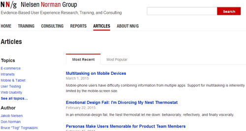 Nielsen Norman Group上的的文章内容涵盖网站可用性、用户测试、UI设计和用户体验等方面,是由Jakob NielsenApple Computer 的前研究副主管Dr. Donald A. Norman所合创的。网站追求实用、精确和精简的设计,所以内容方面很值得一观。