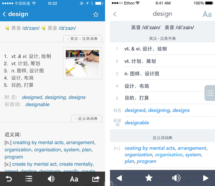 主流的词典应用在内容排版上相差甚少,而欧陆词典为词汇界面加入了一条 buttom bar,可以快速定位页面位置、发音、调节主题字体以及翻页。这些都是很实用的功能,但在使用上改进空间还很大。