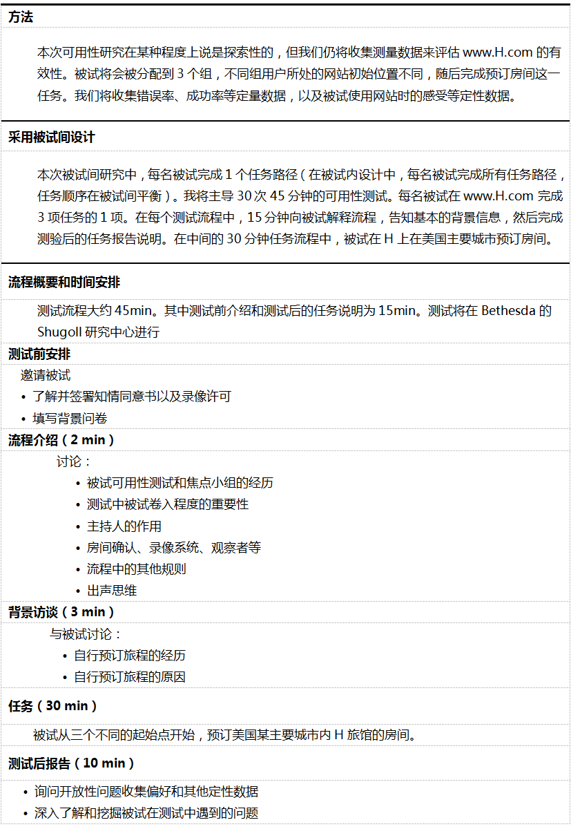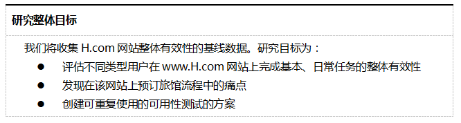 图5-1给出了一个示例:在线酒店预订网站的可用性测试目标。