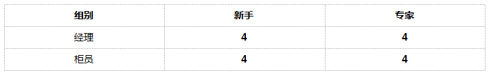 现在让我们进入略微复杂的实际场景。假设你的用户档案包括两类不同的用户组:经理和柜员。你的测试目标之一,是了解两组或多组用户(经理和柜员)在使用产品时是否存在差异;另一目标是每个用户组内的新手和专家用户的使用差异。因此在使用经验和工作类型这两个因素上,分别有两个水平。你的矩阵设计如下: